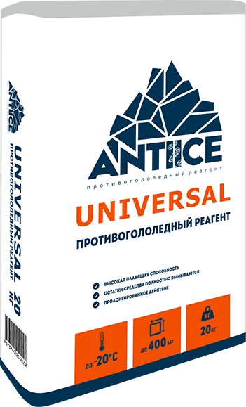 Противогололедный реагент ANTIICE-Universal предназначен для борьбы с ледовыми отложениями на проезжей части магистралей, улиц, проездов и площадей с твердым покрытием, пешеходных тротуарах, в том числе плиточных, остановках общественного транспорта, территориях промышленных предприятий.